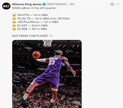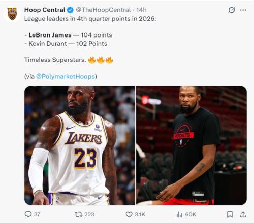 在湖人拒絕公牛逆轉的賽後,美媒曬出進入2026年後,勒布朗末節104分聯盟第一,杜蘭特末節102分聯盟第二,勒布朗41歲高齡,杜蘭特37歲高齡,時光一晃眼過去了10多年,可詹杜雙皇依舊炸裂。