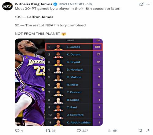 在這個聯盟征戰至少18個賽季的球員中,勒布朗已經拿到109次30+斷崖第一,杜蘭特才17次,科比隻有12次,勒布朗就是曆史最長的河。