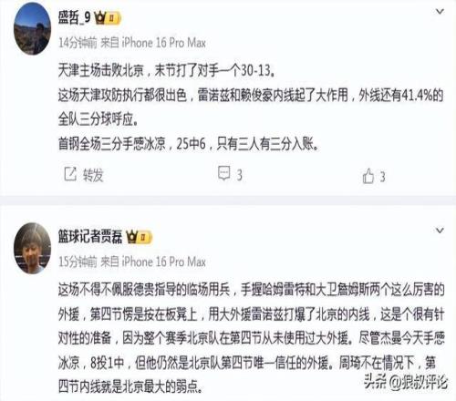 天津主場贏了15分,第四節轟出一波30-13,送北京最近十場比賽第六敗,兩邊對比賽的專注度和調度調整不是一個級別。