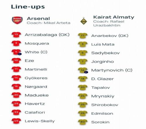 北京時間1月29日04:00,歐冠聯賽階段的一場對決。阿森納坐鎮主場,迎戰阿拉木圖凱拉特。賽前,雙方的陣容公布如下: