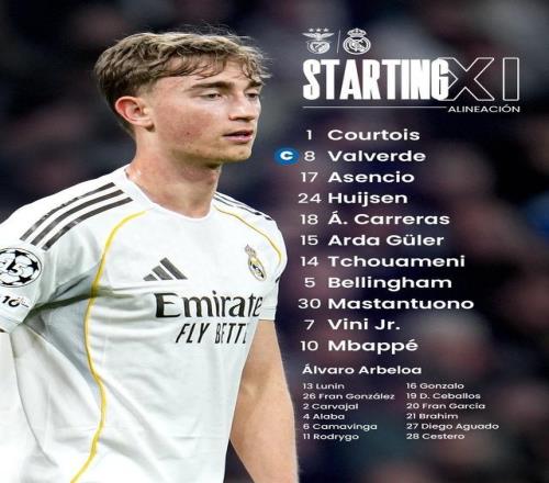 皇家馬德裏首發:1-庫爾圖瓦、8-巴爾韋德、17-阿森西奧、24-赫伊森、18-卡雷拉斯、15-居萊爾、14-楚阿梅尼、5-貝林厄姆、30-馬斯坦托諾、7-維尼修斯、10-姆巴佩