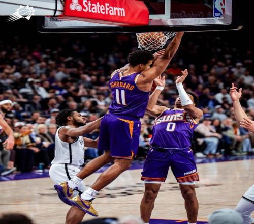 太陽過去兩場連輸老鷹與熱火遭遇2連敗,籃網過去5場遭遇5連敗,本賽季首次交鋒太陽客場126-117戰勝籃網。本場太陽缺少布克、傑倫-格林與吉萊斯皮,籃網缺少馬丁、海史密斯與克洛尼。首節前半節雙方持續交替領先,纏鬥至太陽15-14領先,太陽一波8-0攻勢擴大9分優勢。籃網回敬一波15-5攻勢反超比分,狄龍一度被吹罰一級惡意犯規,首節結束太陽28-29落後籃網。首節籃網23中13,其中三分4中1,波特7中6得到12分;太陽24中13,其中三分6中1,馬威7中5得到10分與狄龍7分。
