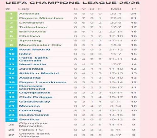 聯賽階段積分榜上,阿森納以24分領跑,拜仁慕尼黑21分緊隨其後。前8球隊直接晉級16強,包括阿森納、拜仁、利物浦、熱刺、巴塞羅那、切爾西、裏斯本競技和曼城。第9至24名球隊將通過附加賽爭奪剩餘8個16強席位,比賽將於今年2月17日和24日進行。特魯賓的進球被多家媒體譽為“門將史上最佳進球之一”,為本賽季歐冠增添了傳奇色彩。隨著聯賽階段落幕,歐冠淘汰賽的硝煙即將點燃,各隊將為最終榮耀展開激烈角逐。