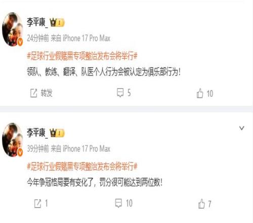 周四10時,足球行業“假賭黑”專項整治行動相關會議在北京召開。媒體人李平康透露,“爭冠格局要有變化了,罰分很可能達到兩位數”。