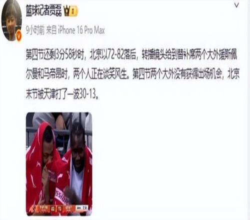 並配文北京隊在落後的時候,北京隊兩大外援斯佩爾曼和馬帝昂被拍到在談笑風生。