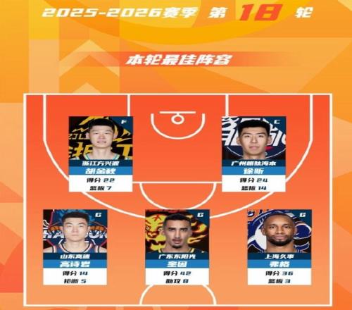 正因為有這樣精彩的表現以及對於比賽勝負的巨大影響力,徐昕在1月24日入選了本賽季CBA第18輪常規賽的最佳五人陣容。