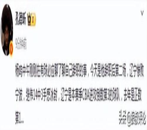 楊鳴中午剛剛在有球必應聊了聊自己辭職的事,今天是他辭職後第二場,遼寧慘敗寧波,繼偉14中3手感冰封,遼寧是本賽季CBA進攻倒數第3的球隊,去年是正數第1。