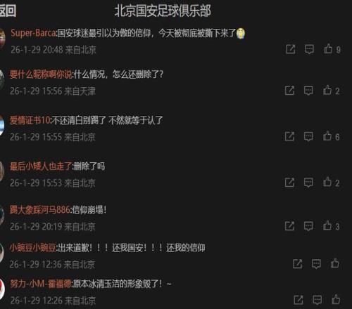 結果出來後,原先北京國安也象征性硬剛一下,不久又刪文。此舉引起北京國安球迷的不滿,大家又在最近的動態下留言(下圖)。有球迷非常失望地寫道:“國安球迷最引以為傲的信仰,今天被徹底被撕下來了[淚]”,還有球迷感歎原本冰清玉潔的形象毀了。更有球迷要求“出來道歉!還我國安,還我信仰”。