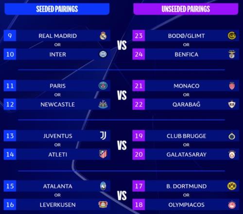 排名9-16的球隊,將作為種子隊:皇馬、國米、巴黎聖日耳曼、紐卡、尤文、馬競、亞特蘭大、勒沃庫森。