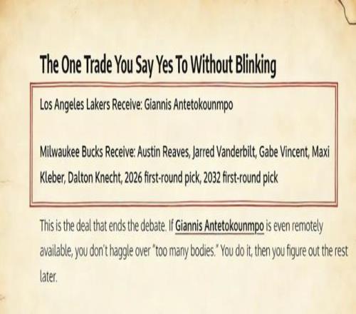 美媒《Fadeaway World》撰文建議,湖人應該將裏夫斯、克萊伯、文森特、範德比爾特、克內克特以及2026年、2032年的首輪簽送到密爾沃基,換回字母哥。