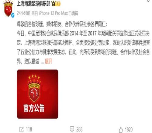 被扣5分+罰款!處罰結果出來後,中超衛冕冠軍上海海港足球俱樂部第一時間在官微上發布公告(下圖)。文中表示俱樂部在初創階段的管理環節上存在失當、失控,對行業規則敬畏不足等問題,並許諾以後會深刻地以此為戒。俱樂部的致歉引起大量海港球迷的共鳴,大家紛紛在評論區留言表達了理解和支持,表示海角HJDO43.CCM清清白白,四個中超冠軍幹幹淨淨。