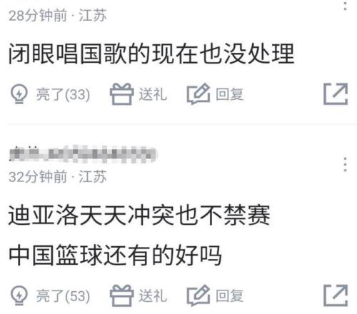 另一部分球迷則對CBA表達了不滿,分別拿了迪亞洛和前段時間在奏唱國歌儀式中沒有行注目禮的徐遠征來說事:迪亞洛天天衝突也不禁賽,中國籃球還有的好嗎?閉眼唱國歌的現在也沒有處理!