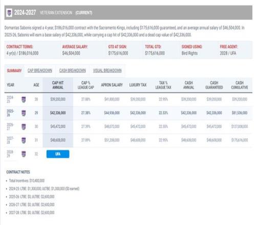 小薩今年29歲,他跟國王的合同是四年1.86億含有激勵條款,本賽季薪水4233萬,小薩還餘下三年合計1.47億,這份合同真的不算小,而且本賽季小薩因為傷病的關係數據大幅下滑,場均29.6分鍾,拿到14.3分11.2籃板4.2助攻1搶斷0.18蓋帽,命中率53.6%,三分命中率16%。