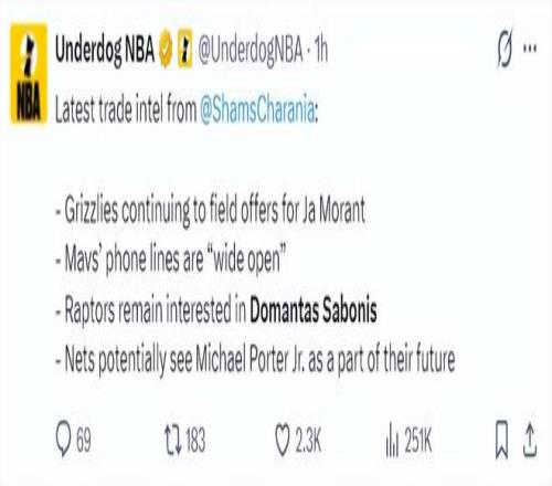 北京時間2月3日,ESPN名記Shams在播客節目中透露了諸多交易流言的細節,比如灰熊隊的莫蘭特已經收到一些報價、獨行俠對隊內大部分球員都聽取報價、猛龍依舊對多曼塔斯-薩博尼斯有意、籃網開始將小波特視為未來的一部分。