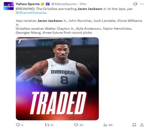 北京時間2月4日淩晨,根據ESPN記者Shams的報道,爵士隊與灰熊隊達成交易,小賈倫-傑克遜將被交易到爵士隊換取三個首輪簽。