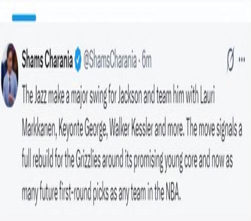 Shams的跟蹤報道是,爵士隊在這筆交易後表示,球隊將與小賈倫-傑克遜、馬爾卡寧、喬治、凱斯勒等球員一同視為未來一部分。這一舉措表明爵士隊將圍繞這套極具潛力的年輕核心陣容進行重建,而且爵士隊目前手握的未來首輪簽數量也與任何一支球隊相當。