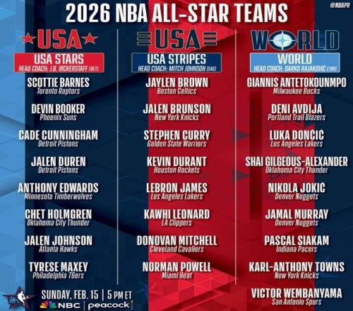 隨後NBA官方公布2025-2026全明星分隊結果,具體為美國新星隊、美國星條隊,世界隊。這當中星條隊詹杜庫再次聯手,還有倫納德、鮑威爾、布倫森、布朗和米切爾,完全沒有中鋒的陣容。而世界隊這邊競爭力還是非常強的,東契奇、約基奇、亞曆山大、字母哥、文班亞馬,要是他們全力出擊,美國隊這邊可能真的擋不住。