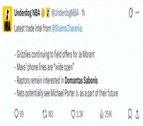 猛龍隊被認為是目前對薩博尼斯興趣最濃厚、行動最積極的球隊之一,他們提出的核心交易方案是送出RJ·巴雷特、雅各布·珀爾特爾以及一個未來的首輪選秀權,以換取薩博尼斯,不過,國王隊方麵對珀爾特爾的背部傷勢存在顧慮。