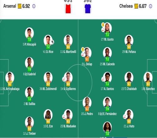 切爾西首發:1-桑切斯、27-古斯托(87'34-阿奇姆彭)、29-福法納、23-查洛巴、21-哈托(61'41-埃斯特旺)、3-庫庫雷利亞、25-凱塞多、17-桑托斯(75'49-加納喬)、8-恩佐、9-德拉普(61'10-帕爾默)、20-若昂-佩德羅