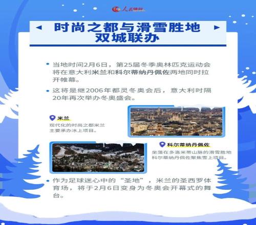 第25屆冬季奧林匹克運動會將於當地時間2月6日至22日在意大利的米蘭和科爾蒂納丹佩佐舉行。中國體育代表團的126名運動員將參加7個大項15個分項91個小項的比賽,是境外舉辦冬奧會中參賽項目最多、運動員規模最大的一次。