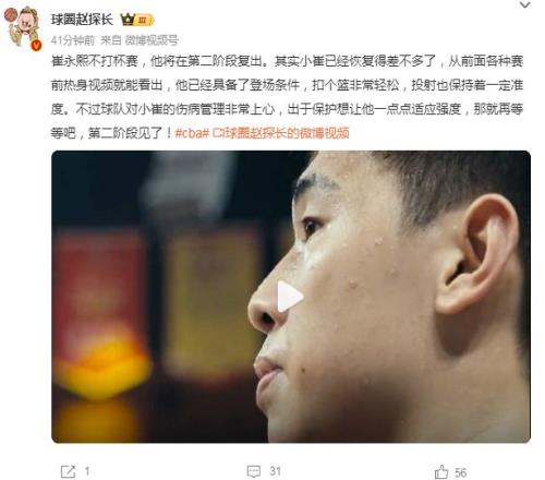如今根據球圈趙探長報道:“崔永熙不打杯賽,他將在第二階段複出。其實小崔已經恢複得差不多,從前麵各種賽前熱身視頻就能看出,他已經具備登場條件,扣個籃非常輕鬆,投射也保持著一定準度。”