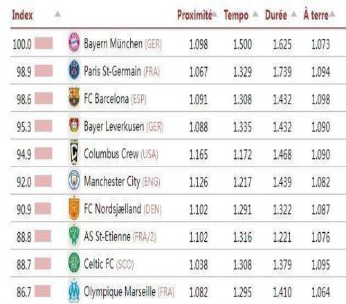 知名數據評測機構足球天文台(CIES)基於合作夥伴Impect的數據,結合58個主流聯賽公布了全球最具“控球主導、傳控風格”的球隊排名,拜仁以100分的基準分登頂榜首,巴黎巴薩分列二三位。數據核心排名標準通過以下四項技術指標綜合評定:傳球距離(越短越好)、控球階段的傳球速度、平均單次控球時長,以及在前場三分之一區域,膝蓋以下接球的百分比。排名第一的拜仁獲得了100分的綜合評分(即其他球隊以拜仁的100分作為綜合指標),巴黎、巴薩作為二、三名分獲98.9和98.6分。第4-10名分別為:勒沃庫森(德甲)、哥倫布機員(美職聯)、曼城(英超,92分)、北西蘭(丹麥超)、聖埃蒂安(法乙)、凱爾特人(蘇超)、馬賽(法甲)。11-20名分別為:布拉加(葡超)、博德閃耀(挪超)、吉達聯合(沙特聯)、皇馬(西甲,84分)、哈馬比(瑞典超)、聖地亞哥(美職聯)、錫爾克堡(丹麥超)、利物浦(英超,81.9分)、洛杉磯FC(美職聯)和埃爾切(西甲)