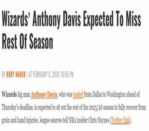 北京時間2月7日,據聯盟消息人士向NBA知名記者Haynes透露,交易截止日前從獨行俠被交易奇才的內線球星安東尼-戴維斯,預計將缺席2025-26賽季剩餘所有比賽,以便讓腹股溝和手部的傷勢徹底痊愈。