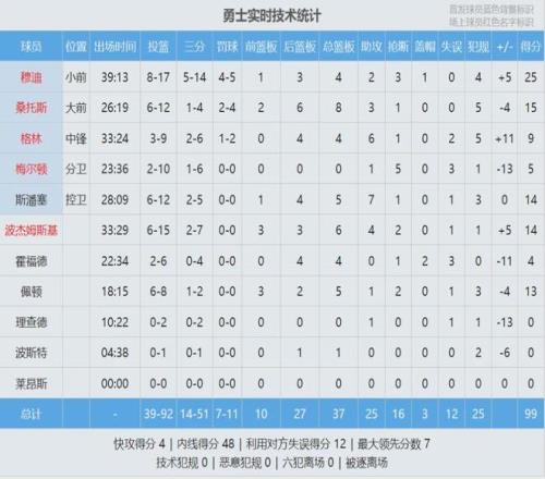 勇士上半場11次助攻8次失誤,兩隊“助攻失誤比”都接近1比1。湖人兩大核心詹姆斯和裏夫斯手感冰涼,詹姆斯8中2得到7+6+4,裏夫斯5中1得到3+4+7。上半場最後一攻,斯潘塞迎著詹姆斯壓哨跳投打進,庫裏在場邊看嗨了。