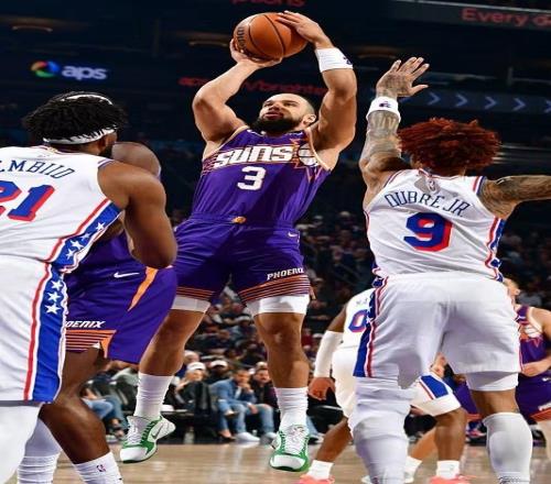 中場休息回來,雙方進攻火力下滑均是單節不足25分,76人率先一波8-0攻勢擴大66-47領先19分優勢。太陽連追5分,76人繼續擴大71-53領先,狄龍與烏布雷一度對噴,太陽反撲追到差10分。恩比德罰球鞏固優勢,太陽衝擊內線追到差8分,馬克西上籃命中,76人單節23-24被追回1分,三節結束76人81-71領先太陽。前三節比賽,76人三分命中數9-6領先,恩比德15中7得到26+9、馬克西16+6+6與烏布雷16分;狄龍17分、馬威10+10與布克10分。