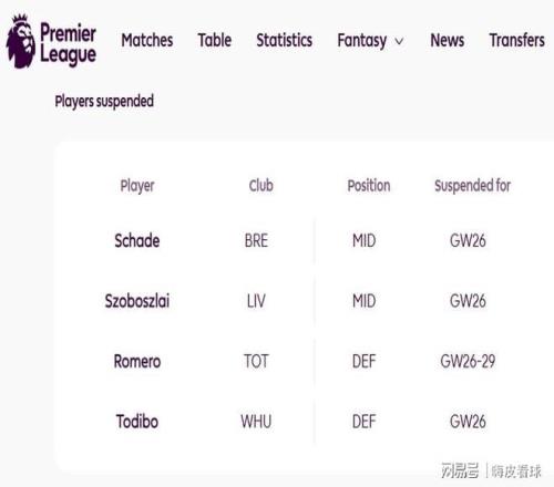 同樣是紅牌,熱刺的羅梅羅就沒有那麽幸運了,英超官方信息顯示,羅梅羅需要停賽四場,由於熱刺足總杯出局,四個對手都是來自英超,分別是紐卡斯爾、阿森納、富勒姆和水晶宮,剛好在客場挑戰利物浦的時候,可以回歸賽場。
