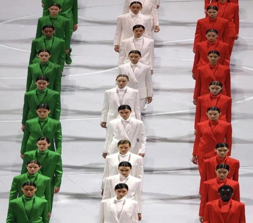意大利國旗入場之際,全女超模列隊身著紅、白、綠三色西服入場,以色彩勾勒出意大利國旗。以優雅又極具格調的方式,盡情展現著米蘭獨特的時尚浪漫與藝術風采。