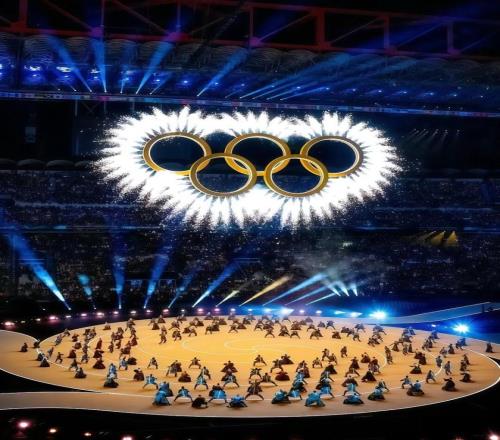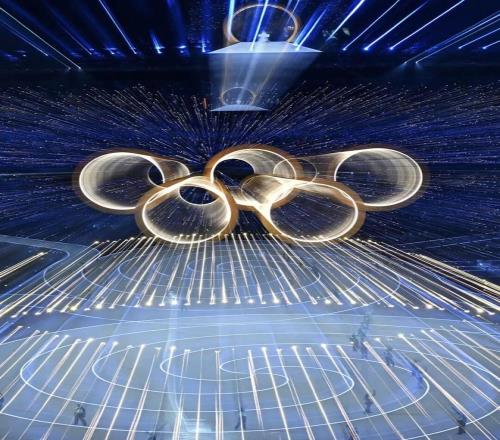 光影流轉,樂聲悠揚,舞者自環中翩然飛出,輕落大地。點點圓環不斷匯聚、相擁,在光影與旋律裏緩緩成形,奧林匹克五環燦然綻放,自然與都市、冰雪與文明,於此相擁。