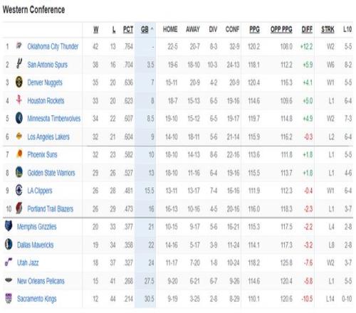 雷霆42勝13負,馬刺38勝16負;雷霆領先掘金7個勝場,馬刺領先掘金3.5個勝場,很明顯雷霆、馬刺在一個檔次。