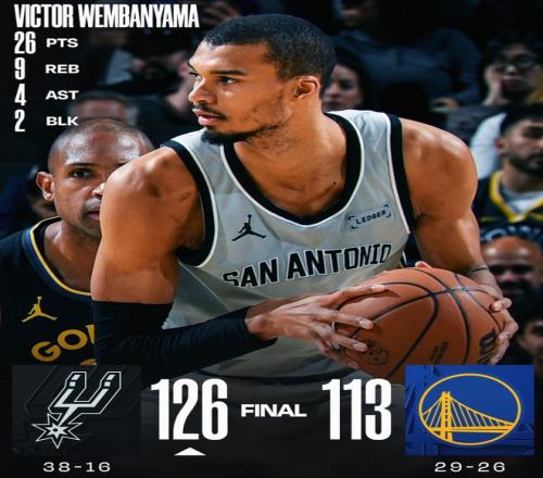 馬刺隊逆轉大勝勇士後已經拿到6連勝,文班亞馬拿到26分9籃板1搶斷1蓋帽,文班亞馬背靠背拿到66分21籃板,馬刺跟雷霆已經與其餘的西部球隊拉開一個檔次。