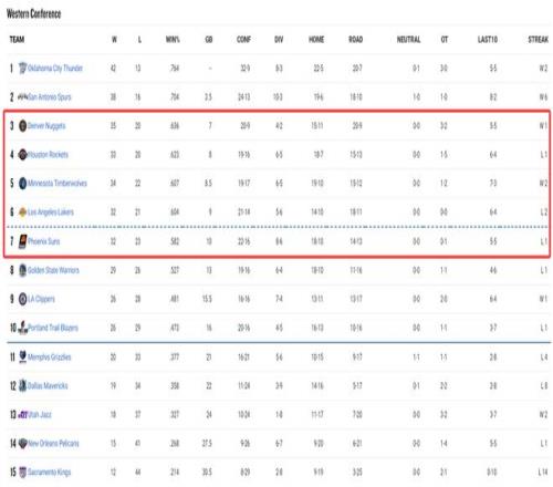 掘金、火箭、森林狼、湖人四支球隊的勝場差隻有2個,掘金隻領先火箭1個勝場,火箭隻領先森林狼0.5個勝場。