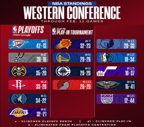 北京時間2月12日NBA常規賽打完,休斯頓火箭隊剛剛坐了一天的西部第三又下落到西部第四,而且掘金擊敗灰熊後跟火箭再度拉開了1個勝場差,雷霆則拿到2連勝,馬刺則拿到6連勝,兩支西部前二的球隊勝場差依舊是3.5個勝場。