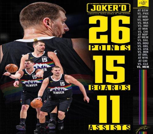 掘金一度領先灰熊15分但在末節兩次被殘陣灰熊縮小到1分,好在約基奇決勝時刻完成1攻1防,最終約基奇拿到26分15籃板11助攻完成生涯第184次三雙,掘金再度回到西部第三。