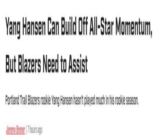 北京時間2月17日,《體育畫報》撰文談到楊瀚森,指出“楊瀚森可以借新秀賽勢頭更進一步,但開拓者也需要給他機會”,具體內容如下——