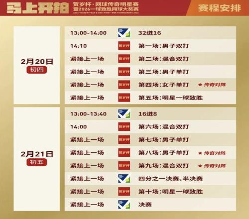 2月20日、21日,中午12:30起開放檢票入場,網球傳奇明星賽將於14:00開始。
