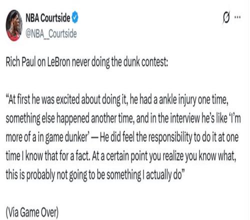 雖然有幾年確實是因為傷病,但在長達23年的職業生涯裏,詹姆斯本有大把機會。這位41歲的球星隻是選擇不參加,他也曾解釋過,參加扣籃大賽從來都不是他的目標。