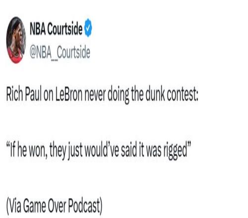 裏奇-保羅在自己的《Game Over》播客節目中大膽斷言,如果詹姆斯當年真的參加並贏下扣籃大賽,外界會是什麽反應。“如果他贏了,人們隻會說比賽是暗箱操作的。”保羅說道。