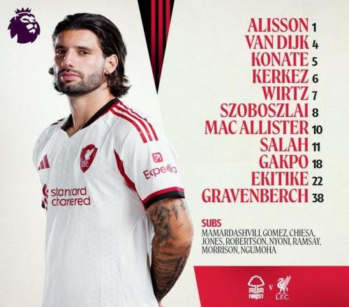 利物浦首發:1-阿利鬆、6-凱爾凱茲、4-範戴克、5-科納特、8-索博斯洛伊、38-赫拉芬貝赫、10-麥卡利斯特、7-維爾茨、11-薩拉赫、18-加克波、22-埃基蒂克