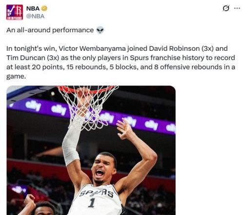 憑借這樣的表現,文班成為馬刺隊史第三位單場至少拿下20分15板8前場板5帽的球員,前兩人是大衛羅賓遜與鄧肯。