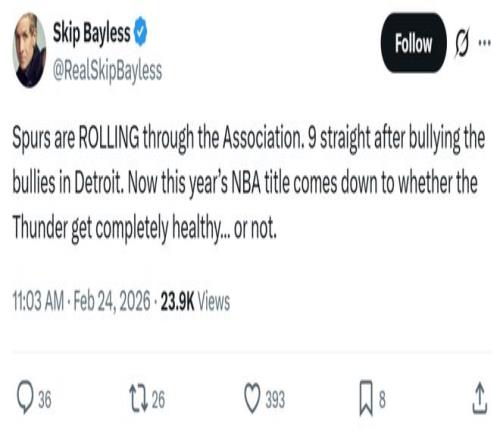 名嘴Skip則表示馬刺隊勢如破竹,不僅拿下9連勝,還擊敗了聯盟第一活塞,現在壓力給到雷霆隊,能否保持健康將決定本賽季NBA冠軍的歸屬。