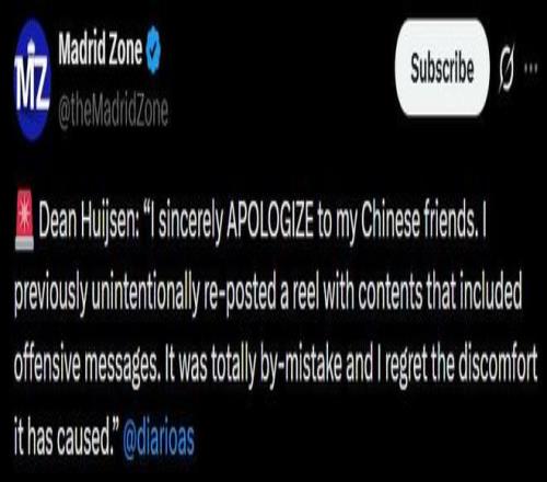 據荷蘭媒體voetbalprimeur報道,赫伊森就其社媒轉發辱華內容公開致歉,通過皇馬微博賬號向中國網友表示:“我真誠地向中國朋友們道歉,這絕非我的本意。”這位20歲的西班牙國腳希望此事能就此告一段落。