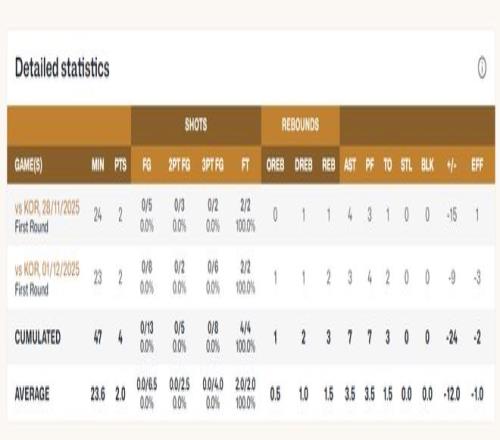 第二場23分鍾,8中3,三分6中0,罰球2中2,拿到2分3助攻1籃板2失誤,合計13中0,三分8中4,在場-24,胡明軒作為男籃前隊長表現非常之差。