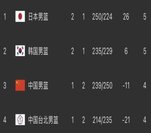 在另一場比賽中,韓國隊意外落敗,以65-77輸給中國台北。在CBA效力的陳盈駿全場13分5板4助,林庭謙18分3板,劉錚10中1,得到3分4板3助3搶斷。在目前的小組積分榜上,日本、韓國同為2勝1負,排名前2位,中國隊1勝2負第3,中國台北隊1勝2負墊底。