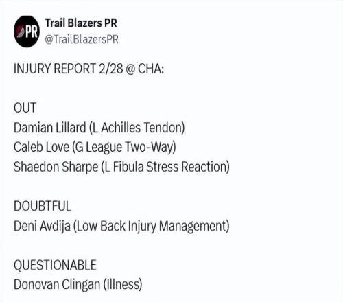 開拓者最新的傷病名單顯示,明日對陣黃蜂,利拉德、樂福、夏普是缺陣狀態,阿夫迪亞因背部傷病管理大概率也不打,生病的克林根出戰成疑。楊瀚森和羅威都不在傷病名單中。羅威上一場比賽得到14分14籃板2搶斷4蓋帽的全麵數據,瀚森DNP,沒有獲得出場機會。
