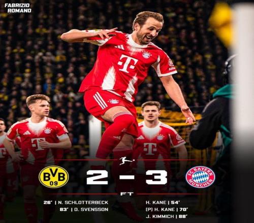 憑借凱恩的梅開二度和基米希的淩空破門,拜仁3-2逆轉絕殺,完成賽季雙殺多特,以11分優勢領跑德甲,24輪狂轟88球!
