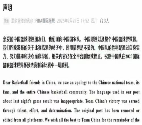 FIBA的補救操作,說白了就是迫於輿論壓力的權宜之計,根本不是真心認錯,在全網聲討的浪潮下,2月27日,FIBA終於發布了中英文道歉聲明。